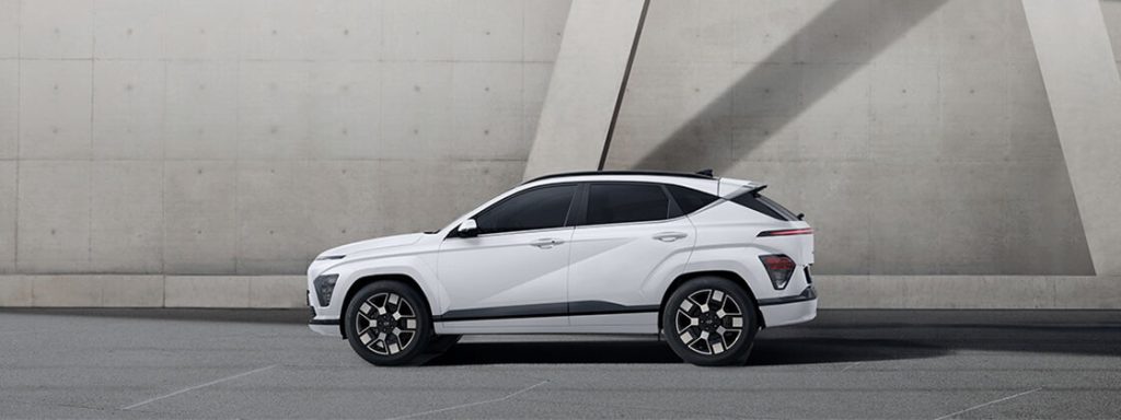 Tampilan KONA Electric yang dinamis semakin menonjol dengan lipatan tajam diagonal pada sisi samping yang menghubungkan cetakan krom satin dari garis sabuk ke spoiler, ciptakan kontur yang membungkus seluruh kendaraan.